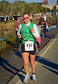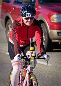 Comments: I had all kinds of food with me and I dressed in layers. I slowly took my layers off. I used knee high socks to keep my legs and arms warm. I have ear warmers and knit gloves. All disposable so I would throw it off at a water station if I needed to. I passed a couple who was racing together. The man said...You the THIRD FEMALE....made me laugh since I knew I wasn't. But it was a nice comment. I think I was just the third to pass them! I rode next to a guy who told me it was his FIRST tri, he had only been training for 2 months and he was borrowing a Hybrid bike. Needless to say he had one water bottle and didn't bring food with him. I didn't see him after the first water stop so I hope he made it ok.... I saw some road graffiti that said...."WATCHOUT FOR GIANT CHICKEN"...and right around the corner was the huge giant chicken statue....funny! I listened to my audio book for the whole ride. Unfortunately I have it on shuffle and the chapters were all messed up but since i wasn't really focused on the book I didn't notice until I was about 30 miles from the finish. At the half way point where they special needs bags were, they had a scout on the road radioing in race numbers so the volunteers could get your bag...one guess whose was lost..........Yep...mine. I had a change of shorts, socks and a jersey. Almost a whole picnic in there with a coke, sandwich, snacks....some of those hot muscle sticky pads that smell of medication. Needless to say the volunteers were sorry and I loaded up on the treats they had there. I put my warm layers in a spare bag and off I went. There was a horrid headwind on the back 30 miles....ugh! Totally killed my time. On a cool note....I stayed in my big gear the whole race! And it felt great! What would you do differently?: hmmm....make sure my special needs bag is there! :) ![]() Transition 2