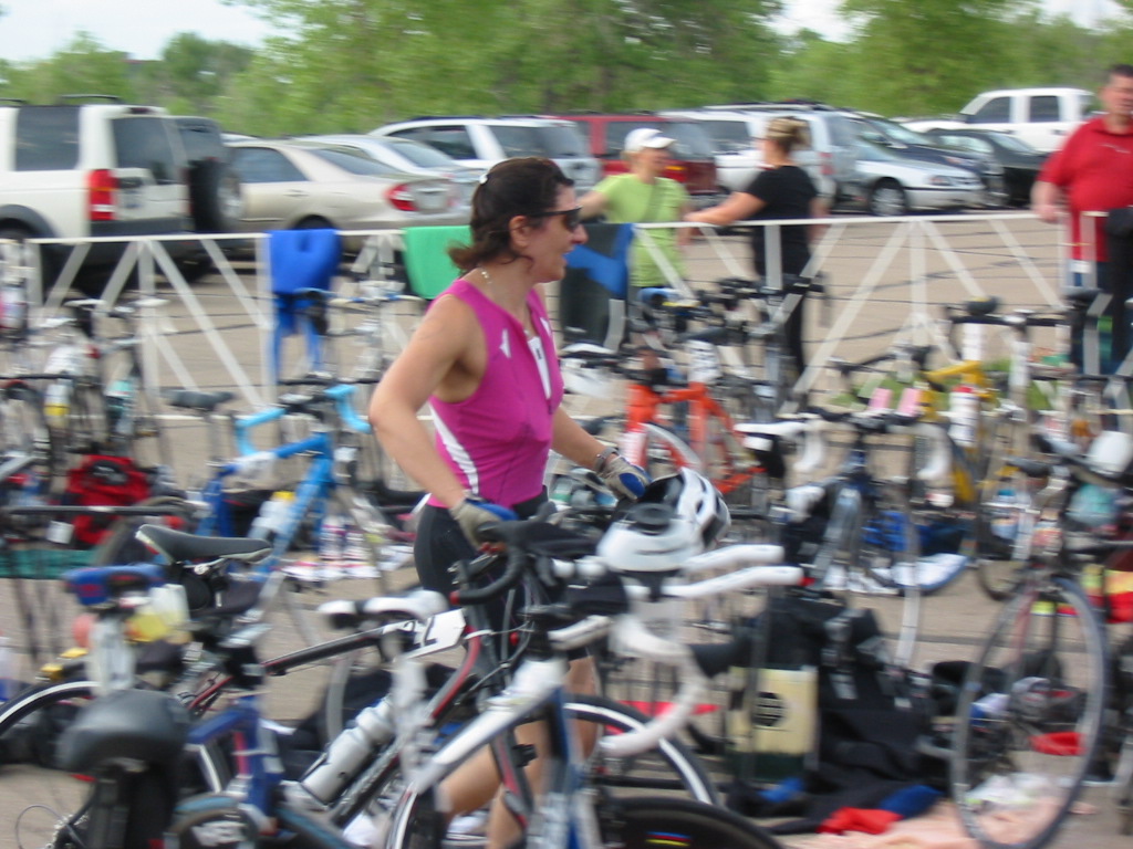Took a nap about 12:30. We were out the door about 3. Got registered and set up in transition at 4:15, and proceeded to wait around in the 80 degree heat until we started at 6:05. Brutal.