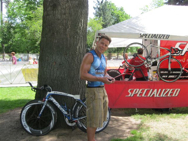 I've had a lot of trouble with it in the past. It had slipped a bit on our preview ride, so I stopped by the Specialized trailer on Saturday to have them look at it just before racking my bike (Desiree Ficker was there tinkering with her bike). Jeff, the Specialized guy recommended some friction paste, but didn't have any. He sent me off in search of the FSA booth. They happened to have on packet of it and I came back to the Specialized trailer. I applied the paste and tightened down the assembly. Jeff said they sometimes cut the post so that it bottoms out at the right height and then just leave it there. Great. Mine has already been cut down by my LBS. I did check and saw that when it bottomed out, the most it would drop would be a little more than an inch. Not ideal, but not catastrophic. My mom had asked if I wanted to go test it out, but I had already checked my Bike Gear with my helmet and shoes. I didn't know if we could get back in and access them, so I just racked my bike. Big mistake! For the record, I HATE THE SPECIALIZED TRANSITION SEATPOST!!! It has now dropped in at least 3 races, including two HIMs and now my first IM.
