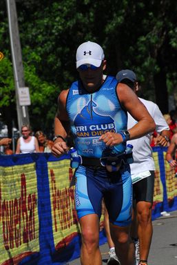 Running into the tent, I unstrapped my helmet and handed it to a volunteer. The guy next to me said, "now we just have to run a marathon." I think that's when I realized how much was still in front of us. I managed a sarcastic reply: "Is that all?" I pulled my Garmin out from where I had packed it in one of one of my running shoes and fiddled with it a bit (not a big fan of the 405 CX - at least not for triathlons!). It took a while to unlock the bezel and get it to start searching for signal. Wasn't too worried as I figured I could use the rest. Once it started searching, I put on socks and laced up my Asics. Grabbed my run nutrition baggy (more Bloks and salt) and my Garmin and was out of the tent. I told the volunteer my shoes were still on the bike and thanked him for taking care of my stuff. I stopped for some sunscreen and hit the mat to start the run. Race time was just about 7 hours.