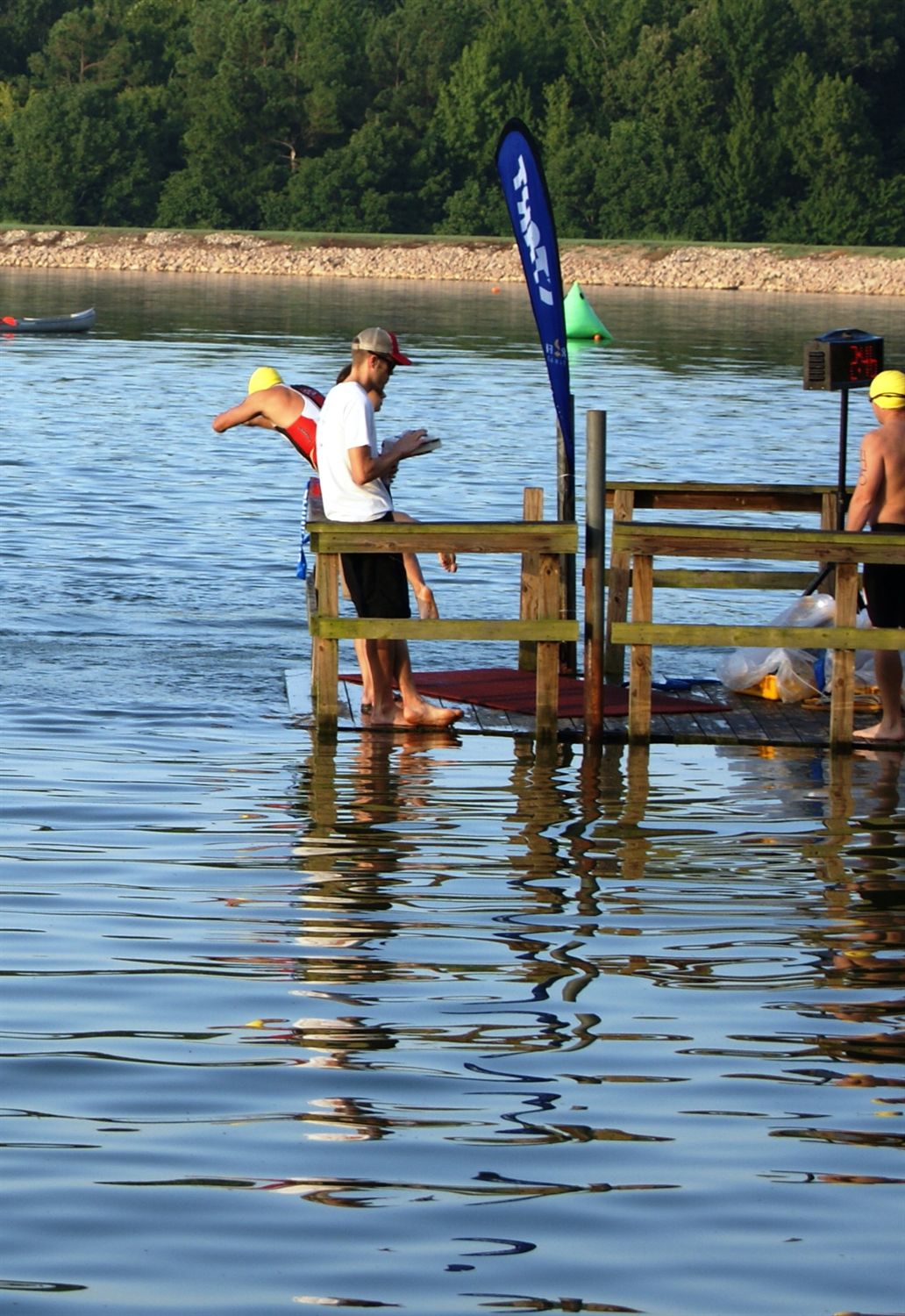 Comments: Again I was very calm before the swim. The time trial start helps with my nerves, but my plan was to get into a good pace until the first buoy, then gradully start rockin and rolling to the end. The swim was a dive start off a dock. Alot of people gingerly stepped off the dock in the water, but I went for a dive. It wasn't the most graceful looking dive, but I passed the guy ahead of me right off the bat. After the first turn, about mid way through that section, some guy swam across me! He was way off course and I was unsure of where he was heading. It actually made me stop for a second to get my bearings, then I was able to get back in my pace. What would you do differently?: Maybe go a little harder at the start. I did not want to burn out. ![]() Transition 1