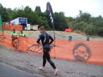 Comments: Very congested and more thrashing than the 2000+ mass start at IMCdA 2 years ago. Got clobbered at least twice (how do you swim in a way that has your hand crashing over the back of someone else's head??) Had a couple guys that just pushed and grabbed and pushed and grabbed... After 10 minutes, it started to thin out and a few minutes later I saw the first yellow caps of the wave before us. Nearing the bouy, the first of the blue caps (the women starting after us) caught me. Ran into a guy walking (could you at least move out of the middle of the swim to walk??) Rounded the bouy and swam in relatively clear water back to the beach. A bit of congestion near the turn for the second loop and then it was back upstream and I wasn't bothered by anyone. In spite of the narrow swim channel, I did manage to find clear water (no-man's-land) this leg but got back to the correct side of the bouys quickly. Hit the turn and just kept swimming back to the beach focusing on roll-breathe-roll. Got into a bit of traffic in the last 200 yards but headed straight up the beach and the timing mats. Was surprised to see 1:11 on my watch as I got out of the water. What would you do differently?: Nothing! This swim was 7 minutes faster than CdA (no exiting to cross the matt) and almost 4 minutes faster than I expected. ![]() Transition 1