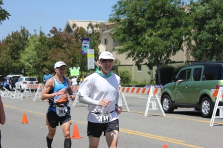 Comments: The ride starts with an immediate uphill at the end of transition and a lot of people walk the 50 yards before getting on their bikes. It was relatively clear, so I hopped on and started pedaling. Spent the first couple miles getting settled before a tricky, right-downhill turn. It's going to be a long day, so just take the first hour easy. Hit the aid station (mile 18) right at an hour and picked up a bottle of gatorade. Ate a protein bar and sipped a bit of water out of my aero bottle during the second hour. The first two hours were pretty congested with a significant amount of passing but really not much drafting. Saw course marshals 6-8 times in the first 35 miles. Hit the second aid station (mile 28) and stopped to pee. It was still quite cool and overcast, so I'm glad my nutrition plan was mostly solid rather than liquid based. Hit the long-gradual climb towards Alexander valley which starts the return towards town. Rode through Geyserville and saw the Meeker winery sign (Meeker is a recommendation from my director who just retired). Ate some cheese crackers before the climb up Chalk Hill. Abbie said there was a lady ringing a cowbell on Chalk Hill last year but she was only part-way up the hill. The cowbell lady was out there again this year so I wasn't surprised that I still had a significant climb after her. Got done with the climb and we head towards Windsor. Felt good to be on some relatively flat stretches and they waved us through all of the intersections in town. I felt like a rock star! Saw Beth and Runnergirl and they got pics as I rode by. Once out of Windsor, I crossed a neat old steel bridge before merging onto previously ridden roads. Hit mile 56 in here right at 3 hours and was still feeling pretty good alothough my neck was starting to get stiff. Finished the gatorade and got another bottle at the next aid station and continued cruising the rolling vinyard roads. Ate the rest of my apple newtons and another protein bar during hours 4-6. Kept expecting the long hill to show up and it wasn't cooperating. By now, my legs are starting to fatigue a bit and my pace is slowing a little. Probably not going to hit 6 hours, but still doing well. Make the climb towards Alexander valley and decide to throttle back to save something for Chalk Hill. The sun came out around noon and it felt good to mix sun and shade as the miles rolled by but the wind was starting to pick up. Staying aero was getting more challenging so I'd mix some upright periods where the wind wasn't too obnoxious. Came past Meeker again and knew that Chalk Hill was coming soon. Stopped at the rest stop for a second pee-break and stretched for a minute. Legs were feeling pretty shot even though I didn't think I'd been pushing too hard earlier, but I resolved to get up the hill and once up, eat my Payday (the last of my solid fuel). Got to Chalk Hill, past the cowbell lady, and up to the top slowly and surely. Ate the reward on the way into Windsor and just pedaled on tired legs. A one-legged cyclist passed me about 2 miles from the end. A little slower than expected, but still a decent ride. What would you do differently?: Not sure...I ride hills regularly so not sure why I seemed "off" almost the whole second loop. Nutrition was good (about 1200 calories from solid food plus 400 from gatorade) and I peed twice (also good, IMO) with 24 oz. water and 48 oz. gatorade. Had it been hotter/sunnier, I would have drank more. ![]() Transition 2