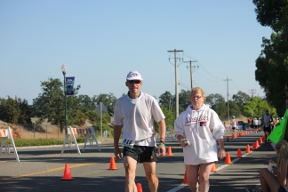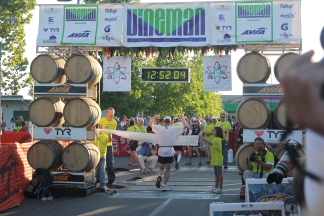 Comments: Clicked off the first two miles at a sub-9 pace and my strategy was to walk the uphills as much as needed. Nothing of note in the first loop, just alternated between water and gatorade at the rest stops. Soaked my bandana cooler in water at the second stop and tied it around my neck. (It's got the funky beads inside that supposedly cool as the water evaporates away.) Hit the turn-around just before 40 minutes and head back towards town figuring that I'm doing quite well on pace even with the uphill walking. Grab a few grapes and a few bites of nectarine coming back into town and hit the timing mat for the first loop at about 1:20. I get a green wristband indicating completion of a loop. (I think the green indicates which hour I finished it). As I head back out for my second loop, I start feeling light-headed and my stomach doesn't want me to eat more just yet, so I walk more and run less and the second loop is about 2 hours. I take a little more to drink and a few more bites of fruit coming back and things are starting to settle down. Get my second band, a white one this time and start the third loop ready to run the flat/downhill sections again. As I run/walk, I make sure to thank the volunteers, particularly on the return. On the way back, I spot a blackberry bush I'd seen 5 times now with berries on it so I stop and take one (very sour...) I'm feeling pretty good by now and am able to re-pass a lot of the people that passed me during the second loop. Make the turn to the subdivision and then the turn to the high school, and finally the turn towards the timing mats and the finish line. 100 yards from the finish, I'm not exactly sure which way to go, but the volunteers point me towards the timing mat (where we turned to start the second and third loops) and the finish is straight after that mat. I hear the announcer call out my name and hometown and see Beth just before the finish line. I "break the tape" marking the end of my second Ironman race. What would you do differently?: The run was a challenge and I dealt (partially successfully) with the late-race demons. Not sure if I went too hard on the bike, but the run was nowhere close to what I expected. No blisters this time but I ended up with a purple toenail on my right second toe. ![]() Post race