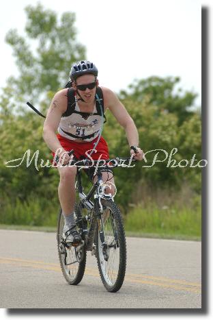 Comments: I kept my pace and gearing just like training. Didn't want to get too excited. I drank 3-4 swallows of gatorade every 10-15minutes. Never had to pee. Had to stop at the half-way to get a gel to eat. About 4 big 'granny gear' hills for me. I recovered quickly from them. The course was quite, serene and relaxing. Lots of farms and feilds to look at. Although I never smelled any breakfast as I passed. I guess the farmers get up way early to do their eating.n I didn't pass anyone. Then again, I was near last on the swim and on a MTB...couldn't expect anymore. What would you do differently?: A real bike would improve my time considerably. I was riding on knobbys. Someday when I am not poor...or when somebody wants to give me a real bike! :) I kept it relaxed pace on the bike...I could have pushed it a lot more if I wanted to. But it was the first race this year. ![]() Transition 2