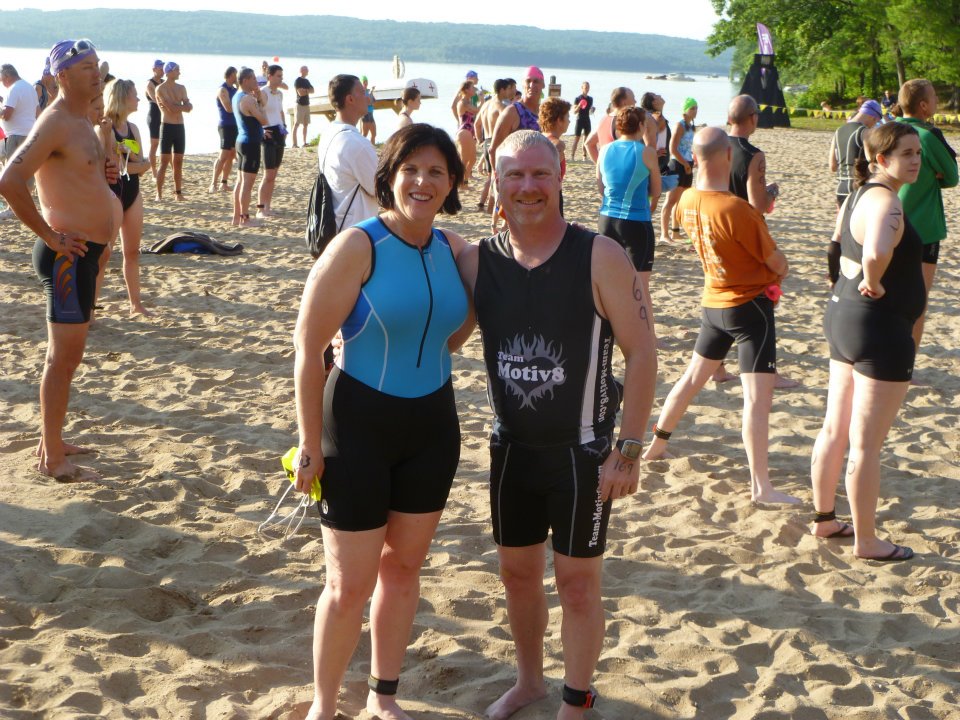 We left the campsite at 7:15am for 0.5 mile drive to the parking lot. Bill didn't want to walk it over. The road was closed already so they rerouted us to another part of the park and we ended up with a 0.75 mile walk/run because transition was closing by that point. Who knew it would take 25 minutes to get 0.5 miles? Threw my stuff in transition. Found someone to body mark me and the racers were being called to the swim area. I ran down there and saw my friends from afar. I noticed that they had a chip on their ankle. Ooops!! Forgot to get my chip. Ran back up the hill to find someone to give me my chip and then back down to hear the rest of the swim instructions. Total panic!! Found my friends, in time for pics with the other sprinters. The oly wave was already in the water.