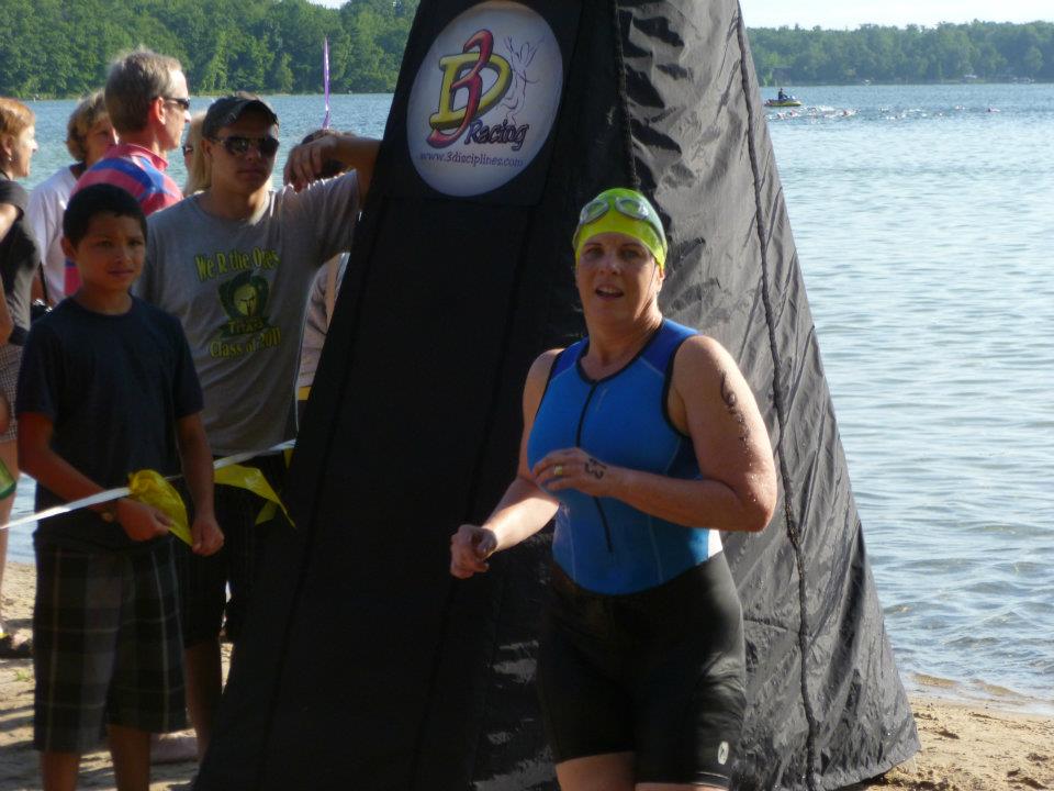 Comments: Thought it was a really well done swim for the lack of swimming that I have done. Water too hot for wetsuits. Breathed every 4th stroke and spotted every 12th stroke. I stayed pretty straight. Got kicked a lot by breast strokers. Not congested at all, lots of open area to find a groove. I never felt like I was in a mixing bowl of people. On the downside, I never found any one to draft off of either. Really thought my swim rocked. Very, very controlled. No breaks, no resets, just swimming. Very shallow at the end, had to walk it in. Lots of warnings about swimmers itch in the shallow areas. Fortunately I did not get it. Out of the swim was a pretty long run up a hill starting on sand to asphalt to trail before clocking in at the Run In area to transition. I figure that only took me 1.5 minutes so my time was pretty close to what I had thought (told my DH 12-15 minutes for my swim). Probably was out in 15. Not sure. Doesn't matter. It was a really awesome swim for me!!! Not really worried about time or pace with anything this race. Happy to not have drowned. What would you do differently?: Nothing!! ![]() Transition 1