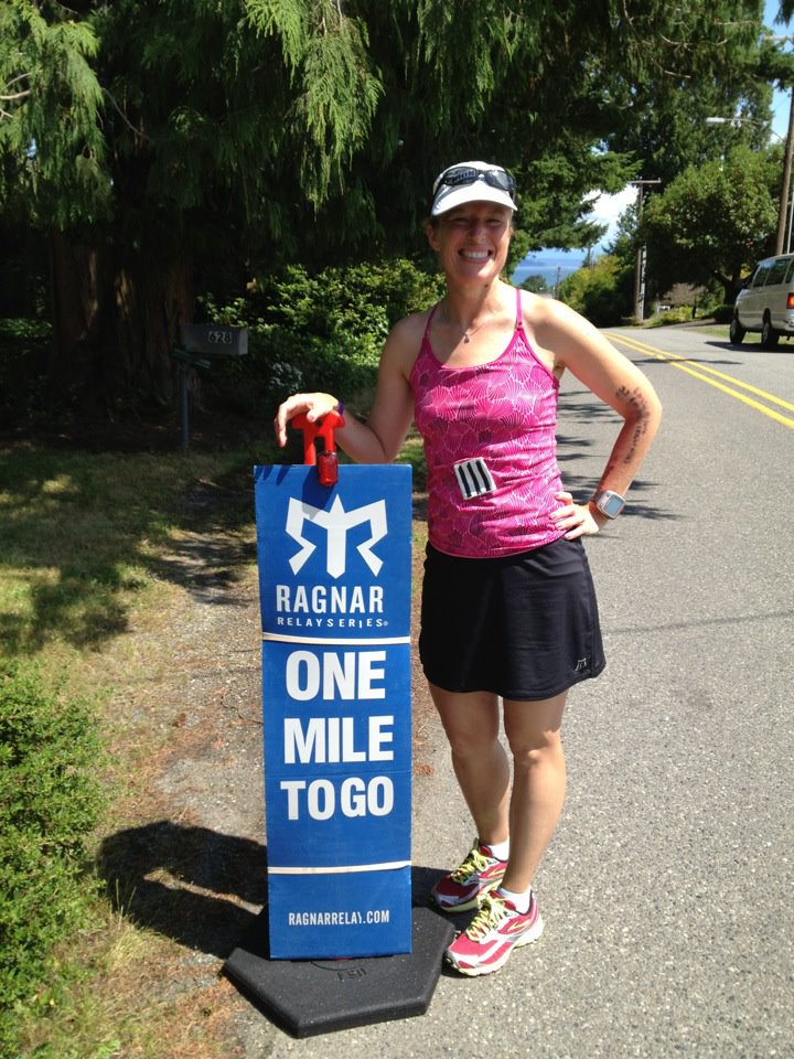 Comments: My first leg was slated to start around 6 or 6:30pm. It had been a long day already, but our team was running well and my start time got bumped up a bit. A bit tricky to plan diet for the day, but I didn't stress too much about it, must made sure to eat mild stuff the last couple of hours and no start off hungry. I went into the race thinking I'd just run a nice, steady pace for my three legs -- almost like a long, slow run. (I was entered in an Olympic triathlon on Sunday, so didn't want to trash myself.) Well, as my leg approached, I started to get excited to run. Van played Foo Fighters for me -- yeah! This was gonna be fun!! Darcy came in and did the hand-off, and off I went! First course for me had some good down, then some long up, then some down, then finish with 3 miles of flat. I took off all pumped up, going down the hill at a good clip. Checked my pace: 6:45. Ooops. Dial it back, girlfriend...!! I tried to settle in to a pace that was pushing it but also mindful of the rest of the weekend. Cranked my downhill, then came a steady climb (1+ mile). My van hadn't passed me yet, and of course I had to look good on the hill, ha!! I just tried to settle in to a steady pace and get 'er done. Passed a couple of people (whee!!!). Missed a traffic light at the top of the hill, rats. The next downhill section I was opening it up pretty well, but then thought of Kim in Boston and tried to shorten my stride a bit to save the quads for the rest of the racing. Made some nice time. When the flat portion came, it felt like I was going up hill again -- hard work!! I was pushing pretty hard at this point and wanted to keep it rolling well. Intially I thought I'd be very happy to do 9:00 pace for any of my legs, but decided I wanted to finish this leg in less than an hour. I had no idea what pace that was, other than I wanted to make it. Pushed on, saw the "ONE MILE TO GO" sign, work it to the end... See Steve... hand off the slap bracelet, done!! Fun!! Made my sub-hour goal time, awesome!! Steve ran his 11-mile leg (and got hard-core chicked by some fast Brooks girl, Lauren B., who became somewhat of a legend for our van, ha!). He did great. We made it to the major 12 exchange, met up with the other van, cheered on Steve to the end, then made our plan for the next 8 hours. We were hungry, so went to Red Robin for eats, then we headed to Exchange 18 to rest up before we started our next running stint. Van 1 continued to run pretty fast, and when all was said and done, we were only at the exchange for about 90 minutes before we needed to get ready to run again. We had about :45 of quiet "sleep" time -- some out on the grass, some in the van. Soon we got word that Ryan P. was running, so we started to get ready again. My next leg was originally slated to start around 4am or so. I had the honor of running over the Deception Pass bridge -- it is stunningly beautiful, what a treat!! My dream was to be there around sunrise, awesome!! Well, our team was keeping up the good pace, so my start time ended up being around 3:20am. Ugh. Darcy's leg finished with a large uphill, and mine started with a big uphill as well. The exchange was pretty sparse, so the van couldn't be with me. Tom walked me down, but then I had to give him my monkey (fleece jacket) and wait for Darcy on my own. She ran with so much heart and soon 111 was coming up the hill! Game on!!! This leg started with some long climbs. It was dark, foggy, and misty. I don't know if the road was under construction or what, but there were orange poles along both lanes, so vans couldn't really stop like on other legs. I just went into a zone, super focused on the ground in front of me, and started to run. This was my best leg in terms of passing people (about 6), and I only got passed twice. I had to concentrate on running and placing my feet. It was a very different run, mentally, super meditative. I could hear my Garmin beep at miles, but I didn't dare look at it and take my eyes off the road. Vans would drive by, but they weren't honking and yelling due to nighttime quiet hours for the area. Kept looking for my van at the few places they could stop, but never saw them. (They forgot what I was wearing, had a hard time seeing well, and stopping places were sparse.) This leg was very solitary!! After racing my first leg, I mostly just settled into this one. I knew it went up a bunch, then down a bit, but overall lots of ups and downs. I passed a woman just before the bridge, and the area to run on the bridge was very narrow, and with the fog I just had to concentrate. I heard her behind me, asked her if I was slowing her down, as there was no way she could pass me back. She assured me I was fine and she was just concentrating on running. She never passed me back. Off the bridge I just worked on finishing as strong as I could. I don't even remember the hand-off to Steve on that run -- brain was clearly shutting off!! Steve ran his leg (8-ish miles?) and then we were off to exchange 24 for some hardcore sleep. Made it there. Steve passed out bigtime in the back seat, Tom slept hobo-style on the sidewalk, not sure where others were. I was in front of Steve, who started sawing logs major. I plugged in my audiobook and checked out. Soon it was time to get up again for our next stint. We "slept," an hour or so??? Oy. They had bad coffee in the gym, plus eggs and pancakes and bacon, but we all had our hearts set on a trip to Starbucks and some breakfast sandos. Yum. So Van 1 was all done running by now... it was around 9am, SO NOT FAIR!!! They could just enjoy the rest of the day!! We got Tom all off on his run and then it was Sbux time. Yeah!! Only crap, there isn't one around here at all. No worries, we'll hit a little coffee shop along the way. One shop, packed with runners, sit-down food, not gonna work. We needed to get Leah off to her next leg and realized it was a ways away, so breakfast would have to wait. This was when I went to my Dark Pla
