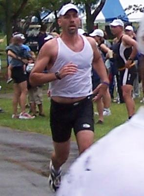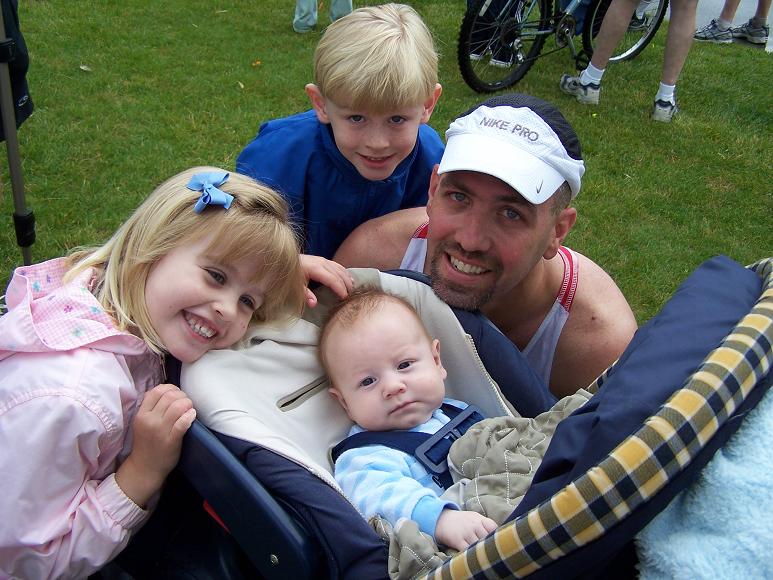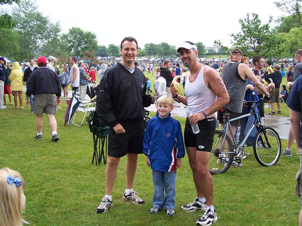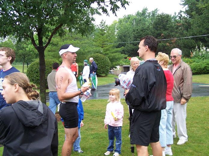 Comments: I took off on the run and tried to concentrate on not going out too fast so that I could minimize the cramps that I knew were coming. As I exited transition I heard someone yell my name and I looked to my right. My wife was walking the kids toward transition to meet me coming off the bike. She was on time with what I had told her but because I was faster they missed me in T2. That's ok, just seeing her there was big boost. I waved back and kept running. Then the cramps began to hit my calves, and since the hammies were jealous they began cramping too. You know, I'm sure that doing bricks has helped me physically, but I almost feel like the mental aspect is where they helped more. I knew the cramps were coming. I knew when they would hit and what they would feel like. I knew just how to shorten my stride and try to run through them. I knew how hard I could push it withoug completely locking up and having to stop. About a half mile into the run they started letting go of my legs. I felt better and lengthened my stride back to normal and took off. I had my first mile at 8:11. I felt better through miles 2 and 3. Whizz said that I passed her at some point in here but I was so into my own thing I was oblvious to people around me. Other than trying to make sure I thanked each and every volunteer I didn't worry about other people. Miles 2,3,4 were all between 7:15-7:45. I was feeling pretty good. When we got to the park entrance again we were coming in the same way as we did on the bike. This time we could pass! Woohoo! I took off for the last mile and basically sprinted the last half mile. I felt great! I felt so good I wonder if I should have pushed harder earlier in the run but I'm guessing most people feel that way after a race so I'm not going to sweat it. I ran the last mile (technically .9 mile) in 6:39. There was a big crowd still at the finish, this was only about 23 minutes after the winners had come in. About 50 ft before the finish I saw my wife and kids so I picked up my two older kids and ran across the finish line with them. It was an awesome experience. What would you do differently?: Again, maybe push harder but I was very pleased I had enough left to sprint the last half mile so maybe not push harder. I don't know, I just know I had a blast.  Post race Warm down: Stood around talking with my buddy, Larry, my folks, wife, kids and my mother-in-law who all braved the rain to be out there. What a great group of people. And to my fellow celiacs - check this out. My MIL brought me gluten free oatmeal raisin cookies and cheese and crackers. I chowed!!! Here's a weird coincedence too. I saw Laura (Whizz) come across the finish and I said to my wife, "oh there's the girl I know from BT." She says, "Yeah, we saw her." I'm like, what? What do you mean you saw her? How would you know who she was? Turns out that when they were walking in they saw her on the run and stood out because she looks just like a girl my wife went to high school with and she was wondering if it was her. So Whizz met the wife and kids. She even recognized Jack from me posting his mug so much on the website. I tried not to keep her too long because she wanted to find Katie who she thought might have had a crash out on the course. So after some milling around, cheering in people, loading up the car, suffering the rain and watching one guy in a white cotton shirt stained with blood from his nipples finish in agony (ouch!) everyone else left and I stuck around. When I say everyone, I mean everyone! The elites all went under the tent on the other side of the park for their awards and I stood under the tent near the finish. I had said I would stay to cheer in the last finishers and that's what I felt I should do. Besides about 6 volunteers the only other people there were a husband/wife combo who had just finished. I chatted with them for a while. The guy said he'd been doing tris for 20 years and this one for 10. He said this was the first time in 10 years it wasn't sunny and beautiful. After a few minutes of chit chat I asked if he knew how many people were still out there. He said he thought they were the last ones but I didn't think that was right because the volunteers were still manning the clock, in the rain, after more than 3 hours. So after a couple of more minutes two girls come into site on the other side of the park. We started cheering for them and urging them on. They ran to finish dead even like champions with big smiles on their faces. The volunteers even asked them who wanted to be first. Not last, first. It was so cool. I wish more of the racers had stuck around for it, but I understand people have things to do and the rain was miserable. What limited your ability to perform faster: Nothing. Overall I'm very happy with the race I ran. Although at every stage I can pick apart things I could have done better it's just nitpicking and I'm thrilled with how things went. I don't know if I could have had a better time, rain or no rain. So I've finally done it. After 10 months and probably more posts than anyone will have before they do their first tri I am a triathlete. If anyone is looking for me at Pleasant Prairie they can look for the black jeep with the cool "tri" sticker on the back from coremultisport.com because that's the kind of think TRIATHLETES put on their cars. ;) Event comments: I have to rate this race "best" because it's my first! This was really well organized. They said it started at 6:30 and it really did. Right on the button. These people know what they are doing. There are no finisher's ribbons or medals because they keep the price down and put all the money into organizing the event and it shows. Great event, great time. Hang loose. Last updated: 2006-06-05  12:00 AM |