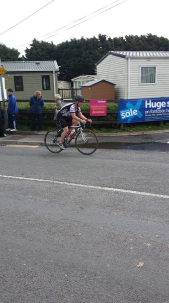Comments: FFS big time. This is where it all went Pete Tong. Jumped on the bike at mount line, free wheeled down the hill a bit to get clipped in, clipped in easy enough. Took the 1st left hand 90 deg bend onto the main road where we'd travel for 50-100m before doing a U-turn to go on the 1st lap. Disaster, started pedaling and chain came of the front ring. Unclipped and stopped, put chain back on, noticed my front derailleur had been bent in. I tried to bend it out a bit and set off again. Chain came off the front and had jammed in the back cog. The front derailleur had completely snapped and had become tangled in amongst the rear cogs. AAAAAHHHHHHHH. I hoisted the bike onto my shoulder and carried it in toward T1 to inform that I'm gonna DNF for the 1st time :( Felt like crying. By this time a crowd had gathered around, I guess in the hope of seeing some blood :) Me and a marshal assessed the damage and we managed to free the metal. Someone suggested that if I could split the chain and remover the piece I could slap the chain on the big ring and crack on :) Genius, why didn't I think of that, oh yeah, 'cos my brain was frazzled with race jitters. Took another few minutes to do that, thank Fachmie I had a chain splitter and power links on me :) The marshal then asked if I was gonna have a little test ride around to check it out? Um, nope, bets get on with the race. I had a lot of ground to gain, I was now last out of T1 by a long way. It would take me nearly 6 km in order to catch up with the person who was last but one. This was on the 10-11% gradient hill we had to climb up at the mid point of each of the two laps. That hill wasn't nice stuck in the big ring. Basically I had to get up out of the saddle and grind my way up both times. This was not nice to my poor little quads (have a little look at the group photo afterwards to see the shape of my quads lol) but at least I was passing people and gaining positions. On the 2nd time I was coming down the hill we climbed I was about 10 meters behind someone else. They were free wheeling and I was in the big ring/gear pedaling like crazy and was just keeping up, perhaps gaining a bit of ground. This makes me wonder if something is seriously wrong with my bike. Most probably my wheels need a major service, or hubs/wheels need upgrading?? Any ideas. It was nice doing the two loop course because at the end of the laps we rode through Pendine where I got a big cheer off everyone that saw the drama at T1 with my bike. Made me suck it in and push harder. The only problem with the course was the chip and seal surface, the potholes, the speed bumps FFS, and the cars I got stuck behind who wouldn't over take a girl free wheeling down at 10mph the 1st time I went back down the hill. Oh, and the relentless wind, meh. What would you do differently?: Buy a brand new bike each time I race and have a crack team of pygmy bike mechanics on hand to service it hourly. I don't think there was much I could do, I ran through the gears when I oiled up the bike whilst setting up. The only thing I could think of that caused it was the wind blowing the bikes racked up in transition and the derailleur getting bumped. ![]() Transition 2