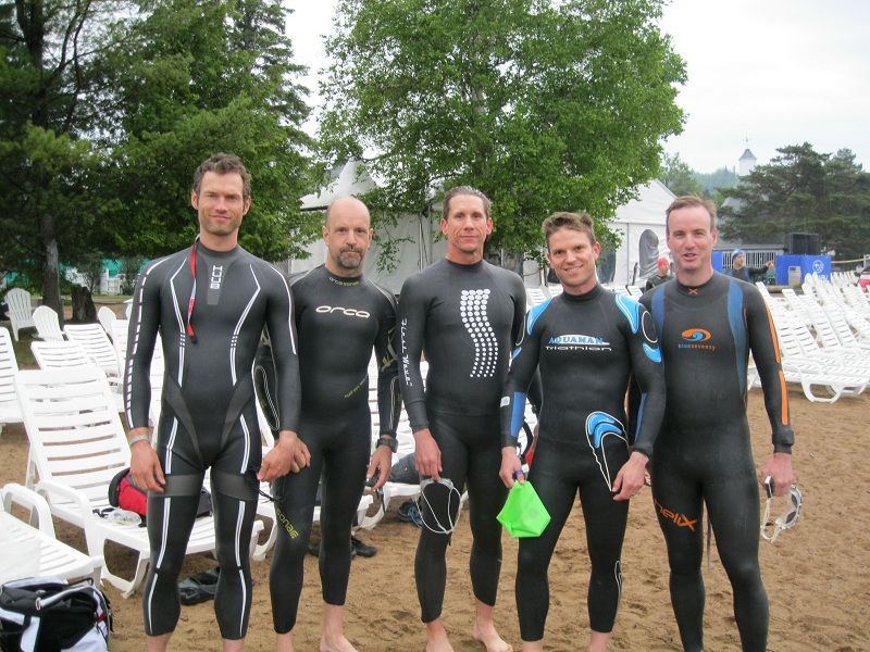 Comments: As we lined up for the start, I looked to my right and saw a guy that was about 6'4" with arms down to his knees (slight exaggeration) wearing swedish goggles and built like a swimmer. Another guy to my left was also wearing swedes and looked ready to tear up the water. I was starting in the right place. :) When the horn went off, I ran as far as I could and then dove in and started swimming hard. I looked both to my right and left to see who was doing what and within about 15 seconds I decided left was where the action was and headed that way. We were going at a hard pace but nothing insane - I felt pretty good and was sitting in about 3rd. Somehow we caught some swimmers from the wave in front of us within about 2 minutes even though they had a 5 min head start - not sure how that happened but anyway. About 10 mins into the swim I was still sitting in 3rd with one guy right beside me - we were both competing for the same set of feet and bumping into each other. At some point he got a 1/2 body length ahead of me and I decided to drop in behind him rather than fight him. Around this same time we started running into more traffic from the waves in front of us and I think he made a bad choice by staying close to the buoy line where everyone else was. It looked to me like it was going to get crowded so I headed wide instead. This may have been a mistake in the end, I'm not sure. From here on I pretty much just swam by myself, staying a bit wide when things got crowded and not getting much of a draft at all. Overall, I just felt "ok" in the water. A warmup may have helped, I'm not sure. I certainly didn't have the great draft pack that helped for the full IM last year. What would you do differently?: I'm not sure. This was the first race I've ever done with waves where I had to worry about working my way through the waves in front of me. I think I just need more experience there. I probably took the conservative route by going around wide. ![]() Transition 1