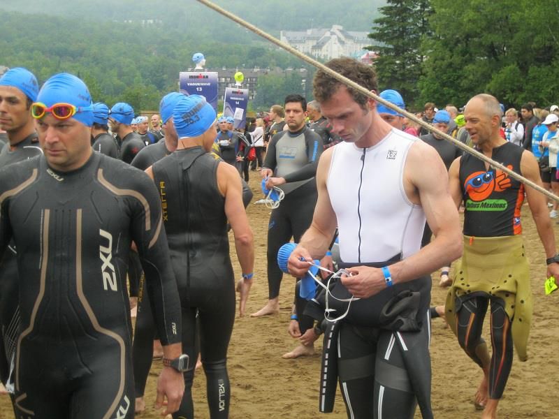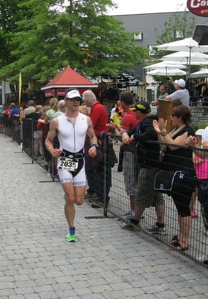 Comments: AP = 202w NP =211w Power targets were to start out 205-215w for the first 20 mins until getting to the first climb. The first section on the Montee Ryan is a constant series of rollers but nothing too steep that needed to go to high in power. I felt really strong and the pace felt really easy. I was immediately passing a ton of people. I was able to do a lot of slingshotting. Again, this was completely new for me. I'm used to swimming at the front of a race and then having people pass me on the bike, not the other way around. The first climb up Conception hill was where I started putting out a bit more power - targets for the long climbs was 230-240w. I took a small sip of my water/gel mixture just before this and just before the aid station at the top I took in some chews and a piece of waffle. At the aid station, I grabbed a bottle of water and sucked in as much of it as I could before ditching it at the end of the aid station. Once over the top, I kept the power to the pedals until I was spinning out and then I just tucked in - max speed down the hill was 77 km/hr. From there to the turn around and back to the hlll is a series of rollers but just steady from a power perspective. Passed a ton more people along here and also started getting caught by some of the stronger rides from my wave. Anytime we went slightly up, people would hammer by me and then I would re-pass them on the downhills. I was good at keeping the water and calories coming in. I ditched my first bottle (300 cals) at the 45km aid station and did the same strategy of taking some chews and waffle right before the aid station and slamming a bunch of water into me during the aid station. Switched my rear bottle up between my arms at this point as well. Again I was passed by a lot of people going up Conception hill and re-passed a lot of them on the descent. Things got a bit silly in the short section through St Jovite, it was really crowded through here and very difficult to just ride how I wanted to ride. AP through here was only 181w. After getting out of town, the ride along the Montee Ryan was good. I did a lot of yoyo'ing with people as they would pass on the hills and I would pass on the descents. One jackass passed me on the right on a hill and nearly caused an accident. I said a few words at him but he didn't seem to care as I saw him do it again later. Going by the 70km mark before the steep hills, I took a peek at my overall stats on the computer. Power was great, average speed was 35.3 km/hr - awesome. For the steep climbs, I just put it into 34/28 gearing and did what I could to limit the time spent over FTP. I was over 300w a few times but never for too long. I finished up my second bottle of gel/water just before the turn around. I knew there wasn't many places on the descent to take anything in. The last 10k has a lot of fast descents, I passed a lot of people on the way down. Speed up into the 70+ range a couple of times. The last 3 mins or so is fairly flat/downhill after one last climb, a good chance to settle and prepare for the run. As we turned towards transition, I took my feet out of my shoes and got ready to dismount. What would you do differently?: Nothing. I rode what felt like a good steady but not hard power. I did my best to ride as legally as possible and felt really good coming off the bike. ![]() Transition 2
