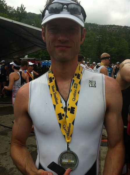 Comments: This is where I had to rely on all my run training. The pace I was given by Shane as a target would be the second fastest half marathon I have ever run (by a lot) so I had to really trust him and myself that I could do it. I felt confident that I could (or at least be close). As I left transition, the watch was still syncing up so I had no pace information for the first 2 mins or so. I just tried to run easy and smooth. Went through the first km in 4:40 - a bit too fast, especially with the tough hill that was in it. The first 5km are in some rolling hills and I just tried to control my effort while maintaining overall pace as best as I could. Kms 2 and 3 were a bit off target pace with the hills but from there I kept it right around the target for the next 8 kms. The turnaround is just before the 10k mark and from there is a very slight incline on the way back. At the 11k mark, my pace started to tail off a bit to the low 5:0x range including one 5:13. When I saw that I knew I had to focus harder and up the effort. That brought my pace back down a bit until getting back into the hills for the last 5k. From there I just fought as hard as I could to go as hard as I could maintain. I was drinking from my water bottle (again with a gel/water mixture) all along taking in 100 cals in the first hour. From there I switched to more coke and a few sips of the gel mixture. I was also pouring ice down my tri suit to help keep cool. I was a bit nervous the first time I did it but it actually felt great. :) I would recommend that strategy for sure, I think it helped a lot (not that it was all that hot out). The last 10k involved a lot of math in my head to figure if I was going to be sub 5 hours or not (what else did I have to do?). I knew that as long as I kept running I would make it and should have a few mins to spare. What would you do differently?: I think I have room to improve in the suffer zone. My run has improved tremendously since I started training with Shane and I think I still have a lot of room to improve more. ![]() Post race