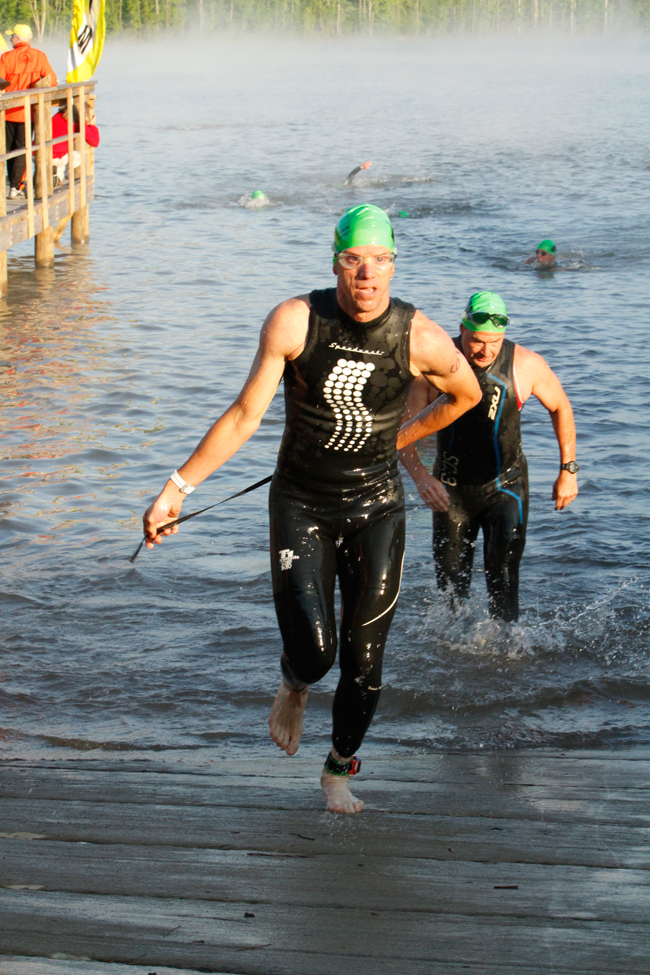 After getting set up and catching up with a few team mates, I headed out to warm up. I walked and stretched for about 15 minutes, then got another 15 or 20 minutes of easy running in. Finished up with a few strides, then back in to transition to strip down into my race kit and put on my wetsuit. I slipped into the water with about 15 minutes to go before the start, and that is when I realized how foggy it was on the lake due to the big temperature differential between the air and the water. You couldn't see 30 feet on from of you, and it was impossible to see the buoys. Looked to be a fun swim!