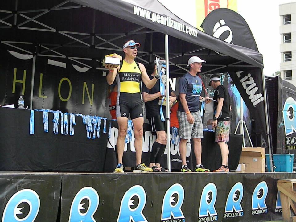 Warm down: I take a few moments to try and recompose myself. Legs are a bit wobbly but they actually recovered okay after I got some food in a bit. Got a nice Finisher's medal and visor! Good food for athletes afterwards and chatted with Bob Evans, who I met at the dinner and was racing the Olympic. I actually passed him during I think the last mile on the run. It was good to talk to him. After recovering, checked results and I finished 6th in AG. I thought that was it as far as getting any sort of award as they were 5 deep for AG Championships in Age Groups. So, I was really quite bummed after I had finished. I had mechanical, technological, and physical issues during the race. The silver lining was that the race didn't count for USAT rankings and was the first one to test all of this out at. So, I could learn for the next one in two weeks. Plus it had taught me that I REALLY need to do hill work on the bike and run! Now I met up with Zach again and he had taken 2nd in his AG. As I didn't have anywhere to go because I had checked out of my hotel and could only check in around 3 at the next, I thought I'd hang around and check out the awards ceremony as well as get more to eat and pack up my gear. It's a good thing I did. What limited your ability to perform faster: Lack of hill work and the mechanical on the bike. I wouldn't say it was a limiter but messed with my mind that I didn't have my Garmin info on the 910XT or the Edge, plus resetting the Edge really upset me at first. Also, I found from the Frederick Half Marathon that having HR info was really useful. But, the soft strap from Garmin and how the sensor is situated didn't give me confidence that it would be okay after the swim. So, I purchased the harder strap one which has the sensor in a waterproof container (this a proven itself months later). Event comments: So before the AG Awards got underway, the MC indicated that like the Pros, the AG Championship awards were based on your series scores, not on how you performed today. Oh my! Dare I hope???? Taking 6th didn't exactly give me much, but there were only 7 finishers when there should've been 14 today. So, 7 guys didn't show and/or finish? Wow, did I have a chance here? Zach kinda wondered where he was too. Well, he didn't have long to wait as he took 3rd. Another HTD member there who took 4th ended up taking 5th in the AG series. Now it comes to my AG..."and in 5th place from Frederick Maryland, DAVE MILLER!" Oh-MY-GOSH!! I am all smiles in disbelief! Nearly all the leg soreness is gone and I bound up on stage to receive my Rev3 5th Place AG Championships Series award package - a BIG MEDAL (pic below), Blue Seventy goggles, $15 coupon for the Rev3 Expo store, 2 packs of Powerbar products, and a nice "Rev3 Winner" pint glass - SSSSSWWWWEEEETTTT! What a way to end the race!! All smiles I think for the next half hour or so! I meandered around for a while more after saying goodbye to Zach. Got a smoothie and headed out to check in to my hotel for the night. Chowed down with some great pizza, beer, and chocolate chip cannoli. YUM! Overall, I think I liked Rev3 Knoxville. While I wasn't too thrilled with the bike course initially, I found I liked it more once I was on it. It was challenging to be sure and I think I would've done decently on the Oly course. A bit too early in the season for a Half for me, though considering the distance I traveled to get here, I would only come out to do this course again if I was doing the Half. I do wish Rev3 had been clearer in the Athlete guide as far as parking went. It would've made my pre-race day less stressful initially. But, Rev3 does a great job with race organization and is family-friendly. Plus I found Knoxville to be a decent city to just walk around. So I would recommend this race to others, more so the Olympic than the Half for an early start to your season. Onward to Great Bear in a few weeks! Last updated: 2013-12-22 12:00 AM