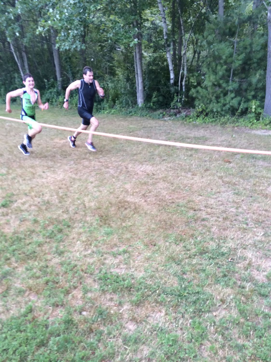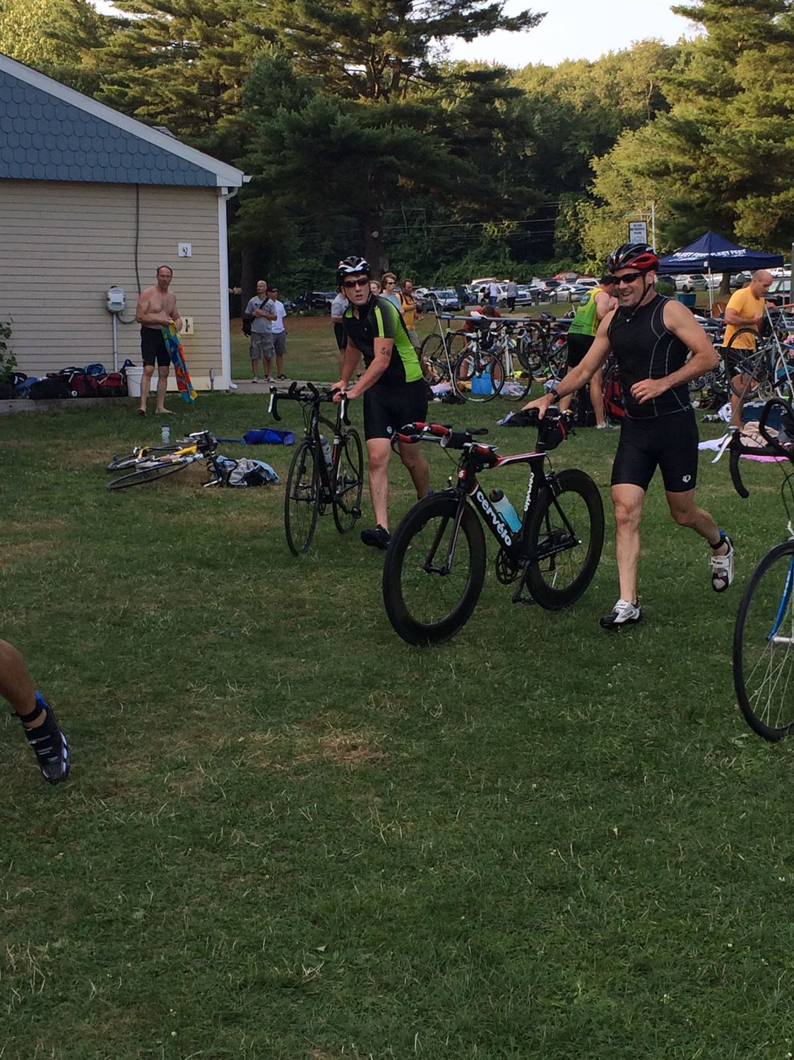 Comments: I tried to push on the two hills this time and keep my cadence very high. Made a mistake being agressive on the downshifting into my small chain ring on the front and dropped the chain going up the roller hill. Had to pull off and unjam it from the side of the sprocket but the grease was off of me by the end of the run-thanks to the excessive sweat-ha! This mechanical glitch was the only one, but 45 seconds would have moved me up about 6 or 7 places in the standings. I saw the entire group of people in front of me on the run, but didn't have it in me to catch them. Av HR=150/peak 161 What would you do differently?: Stay in control a bit more and not be so agressive with the shifting. ![]() Transition 2