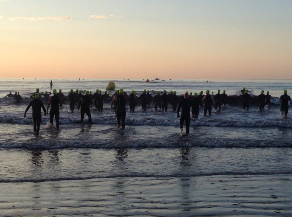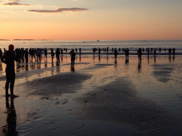 Got up at 4:25am. Made breakfast, packed up and left. Got to the Ballpark with the Rev 3 parking sign at about 5:00am and then hiked my way down to the Transition, about a 1.5 mile walk with my transition backpack. Set up, aired up my tires, hit the porta potties and got my wetsuit on and then headed out to swim start which was about a 10 min walk down the beach. Got there just before the first wave of the half went off. Was very low tide so waded out. Got some help zipping up my wetsuit and waded out in the water, then came back in, After the half waves were done, waded out again and swam a bit. Cold water. Then got out and waited for my wave.