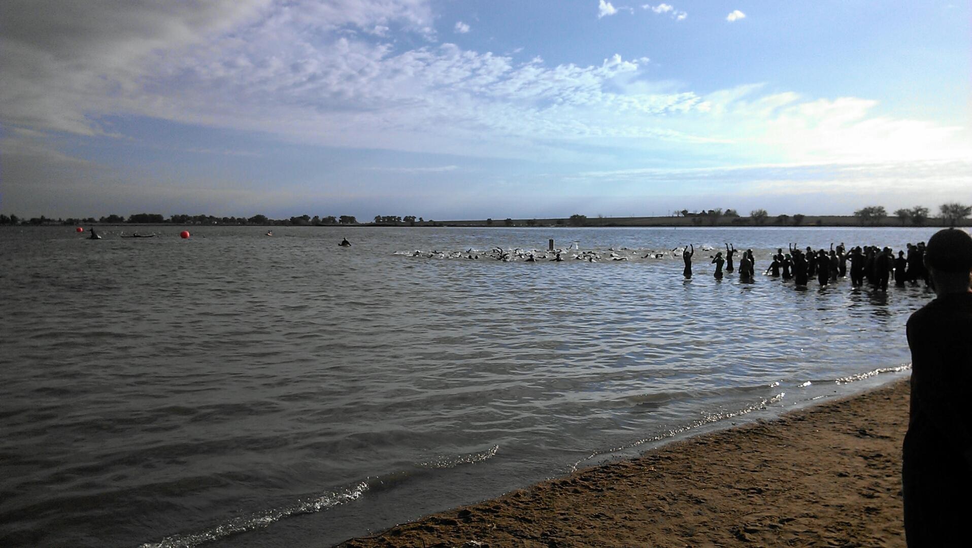 Got in the water a wave or two before ours and got those first few "oh chit" strokes out of the way. Once they called our wave I moved over in to a middle-ish position and got my Garmin ready to go, reminding myself to hit the left button this time!