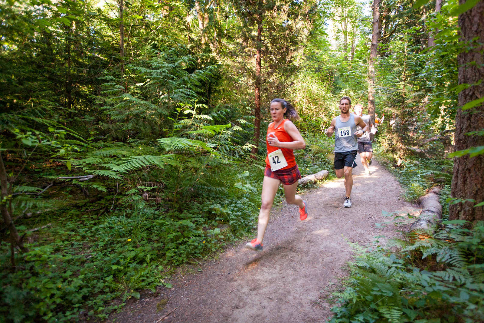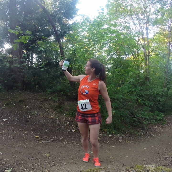 Comments: I decided to push out of my comfort zone a little and lead this race from start to finish (if possible.) I prefer to start in the back a little and work my way up but in addition to getting out of my comfort zone, the 4,8 and 12k were all starting at once and I didn't want to get stuck on the single track portions. So I lined up behind some of our (VERY) fast guys but in front of all the women. They did a 10 second countdown and we were off! The first portion was a wide gravel track that was slightly downhill. I pushed hard here, right from the get-go to establish a solid effort. We hit the first corner and I tried not the decelerate at all. As we approached our first hill I tried to stay very even effort wise. I increased cadence a little and motored up the hill, passing a couple of the younger guys. We had one more short downhill and then it was a pretty steady up, although not steep. This is where I feel I run most efficient and I pushed as hard as I could, putting some distance between me and some of the others. While I refused to look back at any point in this race, I could hear the breathing and I used that as my motivation. Which, kind of sounds weird haha. As we neared the rim trail of the ravine we broke out into the sun for just a minute and I was instantly REALLY hot. We have been experiencing a bit of a heat wave here in Seattle and it was still about 80 degrees. My number was pinned to my shirt so I didn't have the option to take my shirt off. Luckily we dipped back down into the forest a few seconds later where it was slightly cooler and certainly less exposed to the direct sun. We made a turn onto the wider trail and made a long descent. I have been working on my descending and felt I did quite well but I could hear a few taking advantage and closing the gap on me. Just as I was able to see someone approaching in my peripheral, we made a hard turn uphill and I was able to leverage my strength and motor up. This was about the point in the race where I was starting to struggle to maintain the intensity but it was also the most important time to stay committed and focused. I dug in and just kept moving my legs. I could have sworn I heard someone approaching so I even accelerated up and over the hill and through the next descent. We descended a very narrow trail that was quite overgrown. I ducked a blackberry bush the broke out into an open field before turning down onto the one asphalt section. This was only about 50' long and then we turned back onto the gravel for the finish. Up to this point I felt as though I could be overtaken at any point and was pretty much running scared. Again, I didn't allow myself to look back at all. I pushed hard through the finish and broke the tape for the overall women's win. Only then did I look back and realize there wasn't another woman for another 20-30 seconds. I don't love to do it but the run scared method seems to really push the pace :) What would you do differently?: Keep working on the downhill running ![]() Post race