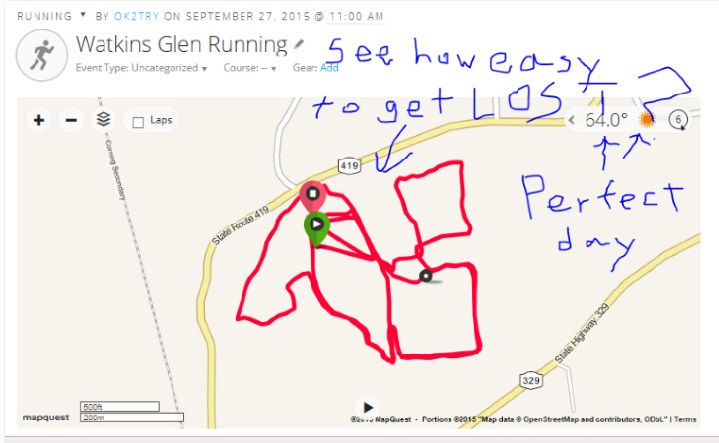 Course: Race was in Watkins Glen State Park, mostly on nice wide trails through wooded areas plus some on grass. All dry. It included 2 moderately difficult uphills and some smaller ones. On my walk-through, I could see it would be easy to go off course. There were 4 loops, which were repeated a varying number of times, and the wooded paths all looked pretty similar. It was very well marked, though, with signs & arrows.