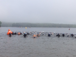 Hung around feeling the usual butterflies but I love the pre-race excitement now. Still, I was more anxious than usual with Kyle racing and wanting to push the pace this race and starting out the swim fast has always gotten me into trouble so I did an extended warmup. The start was delayed as you couldn't see past the first buoy and people could not be tracked in the water safely. The race started about 1/2 hour late when the fog cleared enough to see the course. In the overcast skies, I was able to see the back side buoys for the first time-ha!