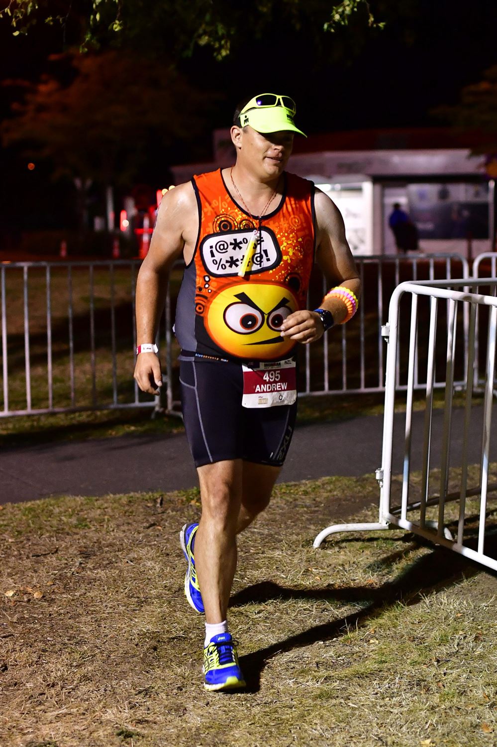 Comments: In my pre race planning, I had said I wanted to be running no later than 5pm. As that leaves 7 hours to do the marathon, meaning that it could be walked at 10 min/km, Despite all the struggles with the wind on the bike and the swim, I started running at 5:01pm. So I had 3 x 14km laps to do in 7 hours, that's 2:20 a lap, or 1:10 to each turn around. I can do that. I had been negotiating with myself towards the end of the bike how to approach the run. I was tired, my legs felt terrible so I had decided to walk the first lap, and see how it went, firstly how long it took, and secondly how I felt after. So that's exactly what I did. And, it started surprisingly well. with the first few kilometers coming in at a faster pace than 9min/km. Through the aid stations I was a little slower of course, as I took water/electrolytes and coke. I saw my noisy family again as I passed our hotel, about half way to the turn around, and was very happy to reach the first turn in about 1:05. 5 minutes ahead of the 1:10 I would need to average to get to the finish by midnight. The return was much of the same, a painful, but pleasant walk in the sun. Heading back to town the course left the road and followed a path along the lake front for much of the way. That was flatter, and a little more scenic, which was nice. During this part of the 'run' I found myself overtaking the same people multiple times. There were quite a few fast guys on their 2nd or 3rd lap doing the run walk thing, and they would run off into the distance and 20 minutes later I overtook again as their walking portions were much slower than what I was managing. That was a great boost for me, reinforcing that I was better to be walking than trying to run, and totally burning myself out. I got back to the end of lap 1 after another hour and 5 minutes, putting me about 10 minutes of schedule for an 11:59 finish. So, I thought things were going well so I decided to keep up with the walking plan. Unsurprisingly the 2nd lap was more of a struggle than the first. Almost immediately on the lap I found myself starting to slow down. I was able to push and keep my pace ahead of schedule, but it was becoming much harder too keep the pace up. I continued to take water and coke at the aid stations, and the occasional shot blok/orange wedge. I reached the turn around for the 2nd time about 1:08 after starting lap 2. Still gaining time on my schedule, but starting to struggle. Also, by completng the 1st half of the marathon I was going into new, unknown territory, as I had never run/walked longer than 21.1km before. The next part of the run, back to town was when the wheels really started to wobble. I was really slowing down by this stage, the whole way back I never managed to get a kilometer faster than my 10 min goal, so I was losing time on my schedule. And the hurt was starting to go from annoying/bad to horrible/excruciating. Other than the aches and pains in my muscles/joints, I had a sore back after the ride, and something unpleasant was starting to happen in my shoes. The balls of my feet were really hurting, like standing on hundreds of little knives every step. In the end it only took 1:11 to get back to the end of lap 2, so it was the first time I was losing time on my schedule. But the more worrying thing is I was really starting to slow. The end of that lap was much slower than the first. At least that's what it seemed like. At this stage of the day I was getting quite fatigued, and was struggling with the mental arithmetic to work out how I was doing, and what was still required. Looking back at the GPS, I wasn't slowing down as much as I thought I was, but at the time I was getting very worried about the cut off. I didn't think I was going to make it. After a debate with myself for the last 2 or 3 km of lap 2 I unleashed my secret weapon. I stopped walking at the turn around, and started to run. (ok, shuffle) Initially I ran the downhill sections, and at the start of lap 3, I did my 3rd fastest km of the day. It was hurting, but I was gaining on the 10 min/km ghost runner I needed to beat. I knew that If I tried to run too far I risked completely blowing out, and ending up in a really slow walk, that would have left short at midnight. So I went back to what I had trained with, and started a specific run walk. I thought running for 2 or 3 minutes straight might be too much, so I decided to count. Run 20 steps, walk 50 steps (counting on the left leg only) I also think that counting steps helped keep me focused, and in the moment. Passing my family again I told them that I was slowing down, and wasn't sure I'd make it. They told me that I was looking good, and had plenty of time at the speeds I was going. I didn't believe them and said I wasn't sure, but I wasn't stopping either I would finish, or be pulled off the course. They could tell I was hurting, at my wife and father in law drove ahead of me so I ran past them twice more in the next half hour, encouraging me to keep going. Going past the last aid station on the way out, they told us we had 45 minutes to get to the turn around to beat the mid point cut off, and encouraged us to hurry. Now, looking back that's 2km in 45 minutes. So even at my slow pace I was not in any danger of missing, but at the time it really stressed me out. I upped the run walk ratio to 20 steps running, 30 walking. Approaching to final turn around was where the special needs tent was, and I planned to change my socks to help my hurting feet. Unfortunately it was all closed up. Now I don't know if that as always going to be the case, and I was supposed to stop on lap 2. But that was tough. I also started asking volunteers, where the cut off was. I had 20 minutes or so to spare, but for some reason that wasn't registering, I was just terrified of getting a tap on the shoulder and told 'you're done' On the final leg to the finish I tried to keep up with the 20:30 step run:walk, but I kept losing focus and losing