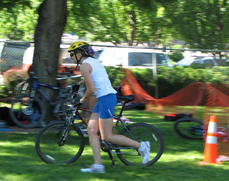 Comments: I like this course, it's a lot of fun with just enough off-road to make it interesting and challenging in a way that's very different from (I imagine) a road bike race, but not 12 straight miles of some insane Xterra style mountain biking. I started out a little jittery and kept up an easy high cadence for the first few minutes until my heart rate slowed and I calmed down. Picked up the pace and managed fairly good speed on the way out to Chamna. I was fast enough that I didn't see any of the fastest people leaving the dirt road section, but slow enough that I didn't see anyone entering it as I was leaving, so I guess that makes me MOP. I'd practiced the course several times so I was comfortable with it and enjoyed it. I was lucky that the person in front of me was going just about the right pace for me, because there's not much opportunity for passing through the single track. I actually passed a few people going through the bark, although there was a sketchy moment when I was passing someone through a patch of loose bark and swerved, then someone comes up passing me on my left, so I'm jerking around a little trying to avoid folks on either side of me. I didn't knock anyone over and I yelled "sorry!" but I felt bad for being a swervy scary biker, sorry people! I was so happy to see the smallish hill on the bark trail (ugh! riding through barks sucks!) because I knew that meant I was just about done and back to paved roads. Passed a few people and put the hammer down intermittently on the way back. Eased up for the final stretch and tried to loosen up legs for the run. What would you do differently?: I feel very happy about my bike performance here. Base training and more speedwork could surely help, but I felt well-prepared, worked hard and enjoyed the course. I do think I could have pushed harder. On the bike and throughout, it would help me to learn my limits and not be afraid to come closer to them. ![]() Transition 2