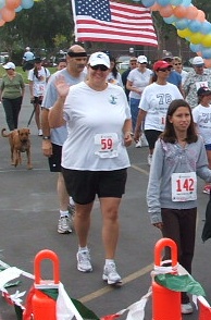 Comments: So the horn went off and off I ran. Well...not really. I was at the back of the pack so I walked until people ahead of me were finally running. For the first part, we circled around the elementary school's field and were running on grass. I quickly found my spot, though I was jogging amongst the walkers. Oh well. At the end of the field we ran through the school's parking lot, then had a cop stop traffic for us to cross the street. On the other side of the street was the start of the trail, where the majority of our run would be. I like trail running, so I really enjoyed this run. I thought we'd be running on the streets of Fullerton...so this was much better. I did have to sidestep several horse poo piles, but I missed them all! The trail was pretty busy with other neighborhood runners, walkers, and the occasional mountain biker. I was trying to keep a pace similar to my training runs, as I didn't want to risk injury. I had decided that I would run 15 minutes, then walk one minute, the entire way. I was nearing the one mile marker, all excited to get some water when it happened...the fast people were already coming back and passing us! D'oh! This was when I realized I need to have a running shirt made up that says "I'm really a swimmer". I checked my watch, and my first mile took 19 minutes. This is a terrible time...I know...but I need to remind you (and myself) that 7 months ago I could only run for a single minute...TOTAL. So, this was a huge improvement. I'm proud of that 19 minute mile! :) As the fast people were passing me...rapidly...I saw Brenda! Way to go Brenda! I got to the first water station and walked for a second, long enough to down the better part of a cup. Then I was off! At one point we crossed a street and continued on another trail. There were two volunteers that were very sweet there cheering us on. This part of the trail then took us past a lake. This was cool, although the lake was an eery, unnatural blue. Creepy. There were ducks, fisherman...it was all very quaint. I was continuing to see other runners, the "less fast, but still way faster than me group" was now heading back. Several people kept saying "Keep going! The turnaround is coming!" We ran through a gate and finally hit the turnaround point. Now was my chance to see who was actually slower than me. There were a lot less people then I remember seeing at the start of the race behind me, yet I was only passed by 3 people. Later my husband told me that some of the walkers had only walked to the one mile mark and back. That explains it. After the turnaround I commented on two ducks that were fighting in the lake to another guy, who seemed much less amused by it then me. Oh well. This time when I passed the two volunteers at the road, they seemed bored, and their cheers were a tad more patronizing. They were quoting a cover girl ad, or something. Whatever. I got to the two-mile marker and saw that I had dropped two minutes and did the second mile in 17 minutes. That's cool. I was more cautious for the first and was now getting into a good groove. I got my next cup of water and apparently the volunteers at the two mile mark were a tad stingier with the water. What's up with that??? As I was running the last mile, I began to pick up the pace. At the start, my goal was to finish in 45 minutes. This was a random guess, as I haven't timed myself running yet. When I saw the time on the first mile, I upped my goal to one hour. As I was closing in on the end of the trail, I saw Brenda and several of the other fast people doing a second lap just for fun. She waved and cheered me on. At this point, I was torn...I could keep at my same workout pace, or start speeding up, since I knew I could, but risk injury. I decided this was a race, if I could speed up, I should. So, I did and passed several people. We left the trail and now had to run uphill on a sidewalk back to the school. My training has all been flat, so this uphill run was a challenge, but kind of fun. Now usually when I train I try to keep my running heart rate under 70% max. For most of the race it had been in the high 70's but hit 90% on the uphill. The sidewalk then flattened out as we rounded the school and came back through the parking lot. I saw my husband and kids waving and taking pictures and could see the finish line. I also saw the official photographer and so I smiled for the last part of my run. Last night I finally found my Brightroom pictures from the OW swim and I look pissed! I hadn't smiled as I was running into the finish chute, so this time, I wanted prettier pictures! :) Yes...forget the results, folks...it's all about cute pictures to show everyone! I rounded the last turn, ran under the big balloon arch and had a volunteer rip off the bottom of my number. I did it. I am offically a runner and have completed my first race. It felt good! It also felt good to realize that I dropped two more minutes and ran my last mile in 15 minutes. What would you do differently?: I think I need to eat a little more in the morning. My stomach started growling at the beginning of the third mile. Also, I would stay off my feet the day before and eat a healthier dinner the night before. ![]() Post race