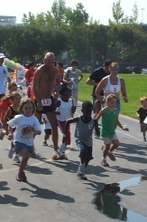 Warm down: My legs had felt good at the end of the run, but as soon as I stopped, my right shin began to ache. I got my Endurox out and stretched a little. Then, I walked around for a while to stretch it out. I walked around the basketball courts for a while, then we started walking over to the post-race activities. I checked the race results but they weren't up yet. There was a whole health fair tied in with this run, so we walked around looking at the different booths. I saw that Jamba Juice was giving out smoothies, but still had Endurox to drink. We talked to the people at the Bonk Breaker booth and got a few bars. I went back for a smoothie and they were out. Buzz kill. I grabbed a cheese bagel and gnawed on that. My kids were scheduled to do the fun run soon, so I grabbed an energy drink and headed over to the start with them. I then saw a guy I recognized from the OW race last week. I said hi and we laughed about both getting our butts kicked by those super fast MV kids last week. Nice guy. What limited your ability to perform faster: The biggest issue is lack of training. I've only been running for 7 months, so I'm still building up distance. Event comments: Now that I was done, we got the kids to the starting line of their race. It was a kids' .5K that was just around the school's field. While the volunteer explained the course, most kids, including my own, weren't really paying attention, so the guy had them watch him run it, which seemed to help. The run started and the kids were all TOO CUTE! My kids got toward the front of the pack pretty quickly, with my son not too far ahead of my daughter. This did NOT sit well with my daughter, as she is 15 months older and expects to be faster. She was faster until recently and is not cool with her little brother beating her. Both of my kids did well. I saw them speed up and slow down at different places. As the rounded the last corner, I laughed as my little rule-follower son didn't cut the corner like the other kids, and went farther. Cute. They finished well, toward the front of the pack. Most of the kids that beat them were older. At the finish line they got medals, which they loved and are still wearing as they watch cartoons! :) We gave them their gatorade (in Spiderman and Dora drink bottles, no less) and their energy bars, which they gobbled down. We then went to wait in a rather lengthy line for the balloon animal guy. My son got an elephant, and my daughter a snake. We waited a while because two teenage girls wanted balloon animals. Seems to me that if you're old enough to wear a bra, you're probably too old for a balloon animal...but hey...to each his own! At this point the event was being cleaned up. I saw my results and was stoked to not be last in my age group or overall. That was my only real goal, other than finishing, which I knew I could do. At this point they were giving out medals and we saw that Brenda won our age group! Woo hoo! Go Brenda! Now I started getting stomach cramps. Not sure why, but they weren't pleasant. So, off to the car to head home. I had a great morning and will never forget my first 5K! Last updated: 2007-07-03  12:00 AM