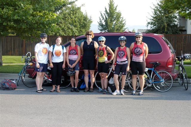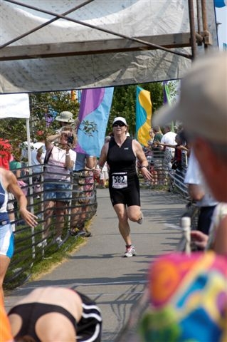 Warm down: I hate that they make you stop right at the end to give them your chip. When I did my treadmill test over the winter, I had to stop right at the end and I could watch my BP drop on the monitor. During the test when this happened, I felt terrible, like I was going to pass out. When I train, I always walk a bit after my run and don't get dizzy when I stop. So the last two races I have just gone by the chip-collectors and tell them I'll be right back. I think they think I'm going to puke or something, but it's worked a lot better for me. I walked away from the finish line and around for a few minutes, then came back and gave them my chip. THEN I got to stand and cheer the rest of the women in. That is a blast. After the finishes, I went and hung around with my buddies at our club tent. One of our members is a massage therapist and was doing massages for us - that was about the best thing ever. Qdoba did the post-race meal...that was about the second best thing ever. :) And I got to run down to pick up my 2nd place medal! Woo-hoo! The timing was all messed up - a lot of people were timed in the wrong age group, which made the race times wrong. They asked everyone to check and to tell the officials, but I bet they missed some people. What limited your ability to perform faster: That's easy - missing the bouy, not being able to clip in, and extra weight on my..um..engine. Event comments: I really like this race. It is well organized, the course is swept clean, there are a ton of volunteers and cheering spectators, and the post-race activities are nice. It's like a big party with music and booths and a water sprinkler park for the kids to play in. If you do this race, remember it starts relatively late at 9am, and the awards don't happen until early afternoon. Overall, this race is one of my favorite and I would encourage any woman to do it, especially as a first race because it is such a supportive atmosphere. Last updated: 2007-05-21 12:00 AM