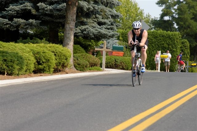Comments: I jogged to my area and only had to look back once to count the racks. I have a squirt bottle to rinse the sand off my feet, so I squirt then put my foot down into my shoe. The first foot went fine but I was a little dizzy and couldn't get the second one rinsed for what seemed like forever. I wear gloves to protect my hands in case I were to fall - I don't want to risk missing the rest of my races for something like that. Helmet on, glasses on, and ran out the the mount line. Could NOT get my foot to clip in. Several people passed me while I was standing there trying to clip in. Darn - need more work. What would you do differently?: Clip in faster. Otherwise, this seemed like a good T1. I was 74th out of 543, so definitely room for improvement. ![]() Bike